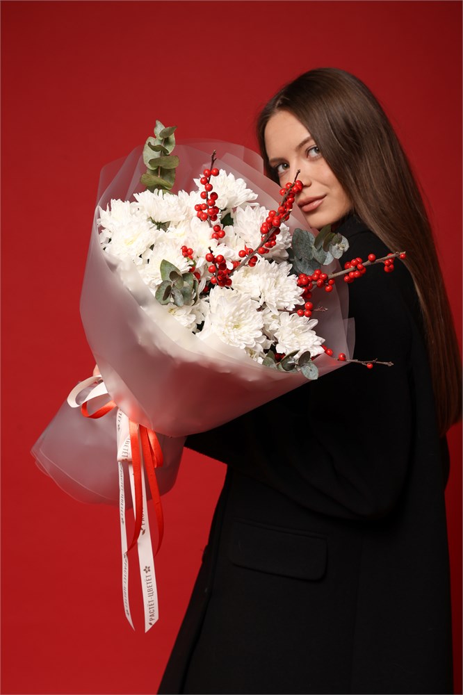 Букет из белой хризантемы, илекса и эвкалипта в упаковке